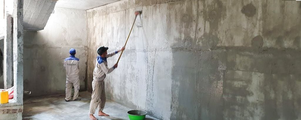 • Quét lớp vữa vừa pha trộn lên bề mặt vách ngoài cần chống thấm. Ở đây bạn có thể quét thủ công bằng chối, ru lô. Hoặc muốn nhanh chóng bạn có thể sử dụng máy phun áp suất cao. Tuy nhiên nhìn chung bạn hãy đảm bảo lớp vữa bám kín khít khắp bề mặt vách ngoài tầng hầm.